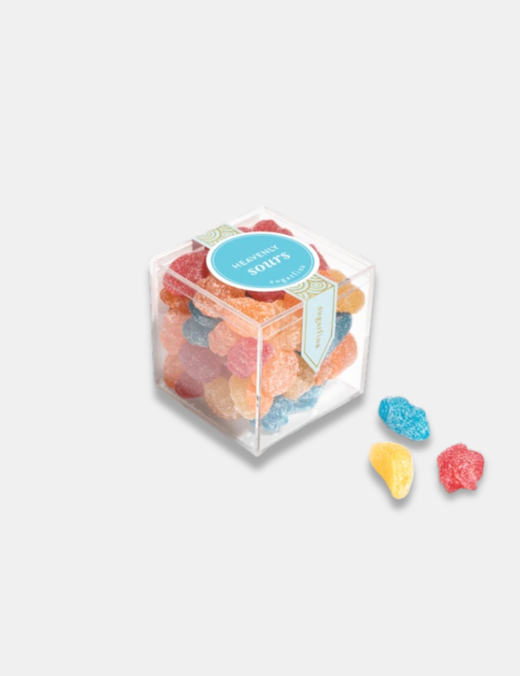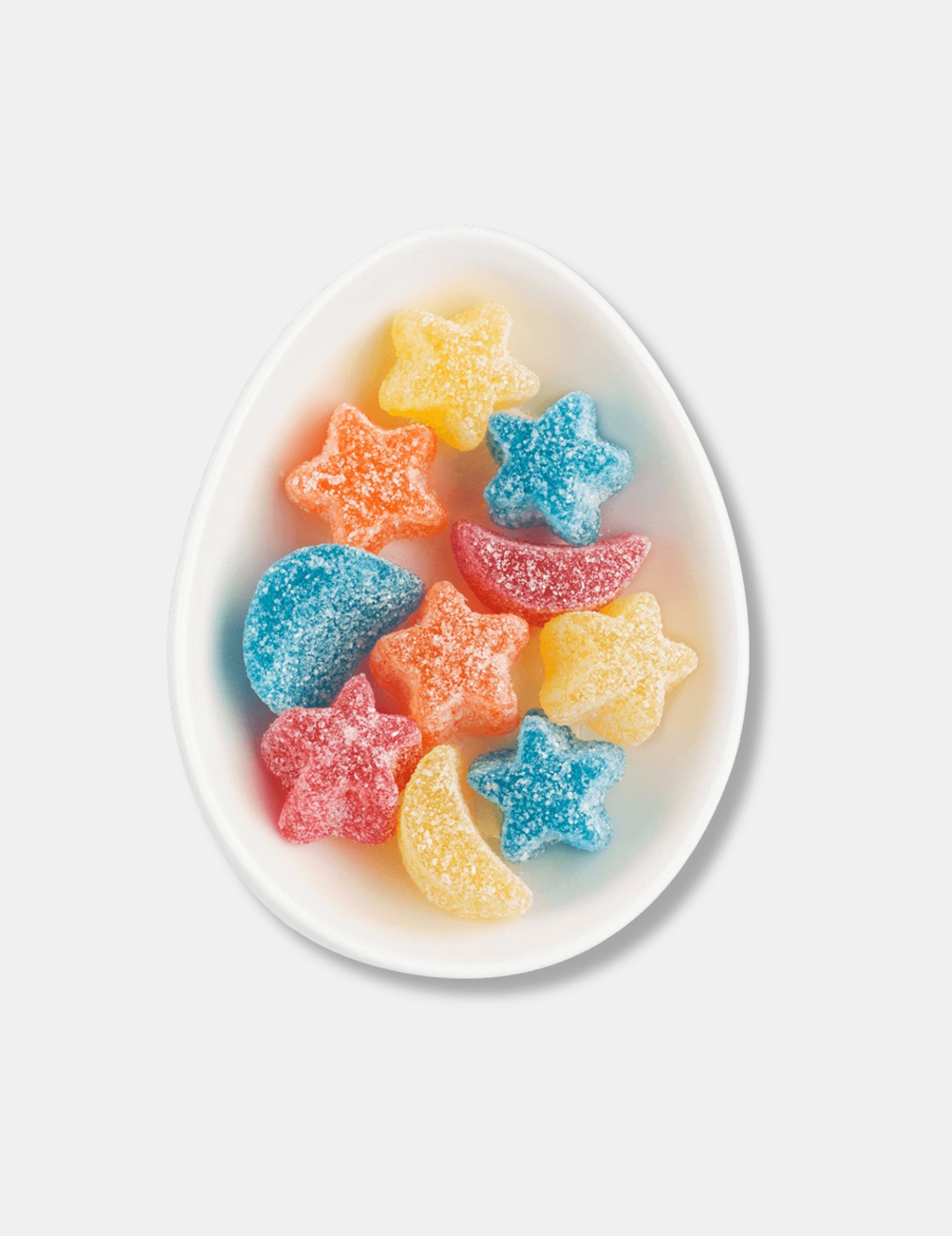 Playful fruit-shaped gummies dusted with sweet-and-tart sugar crystals, offering a perfectly balanced sour-sweet experience inspired by celestial treats.